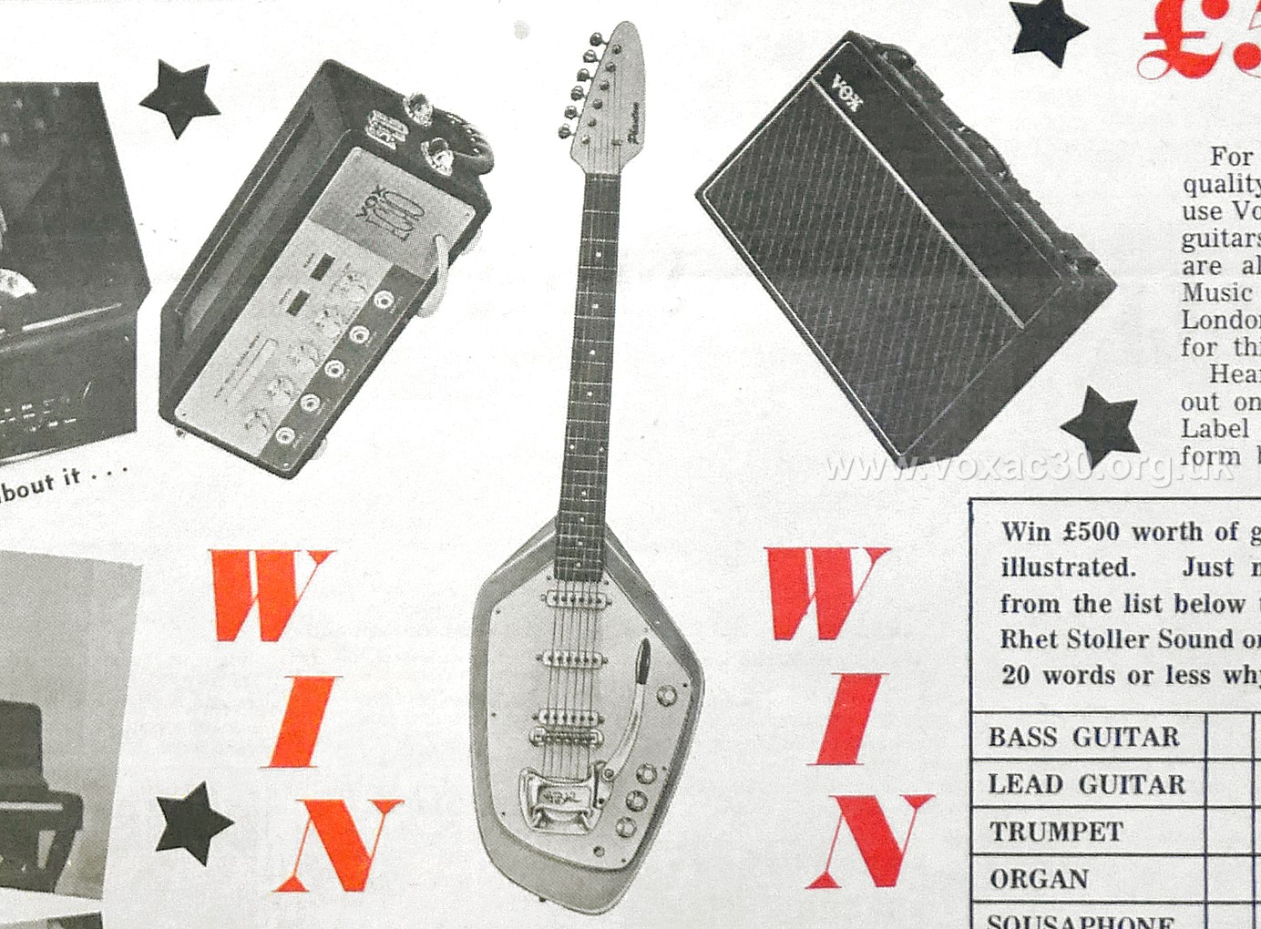 Below, a detail from the Jennings advert for the Rhet Stoller competition - initiated by Larry Macari - placed in "Record Mirror", 7th March 1964. The AC30 represented is an Expanded Frequency amp.