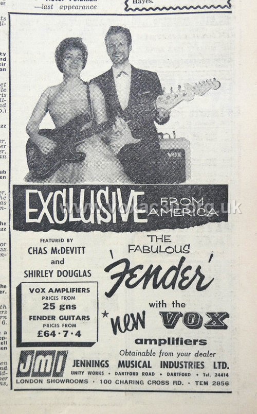 Below, two adverts grabbed from a microfilm of "Melody Maker" magazine, 30th July, 1960. Better images to follow. The advert with Chas McDevitt and Shirley Douglas had been placed in a previous issue of the magazine - July 9th - but, importantly, without the mention of "*new Vox amplifiers".