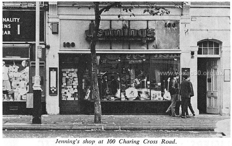 The Jennings Shop, 100 Charing Cross Road, London. Picture from "Beat Instrumental" magazine, November 1964. In the basement, a practice room. On the far left window pane, notices and adverts. For more on the shop, see this page.
