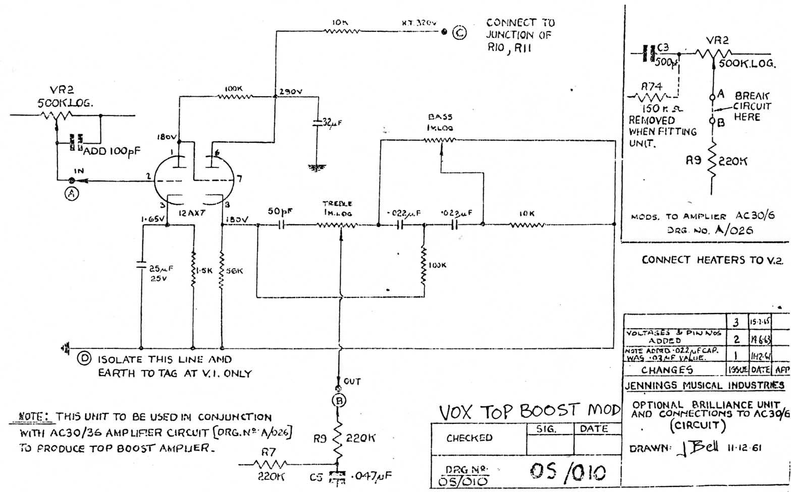 Below, the circuit diagram for the add-on "Top Boost" module (OS/010), drawn up initially on the 11th December, 1961 and updated thereafter - the intention of the circuit, so said, being to provide a means of emulating the greater "sparkle" of the AC30/4, which had recently been taken out of production.