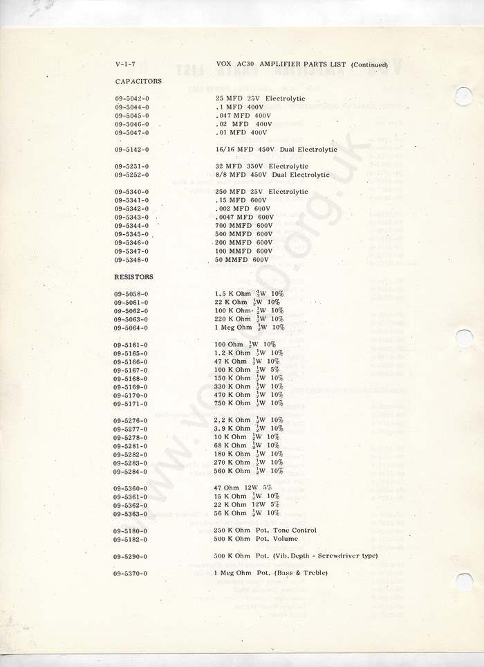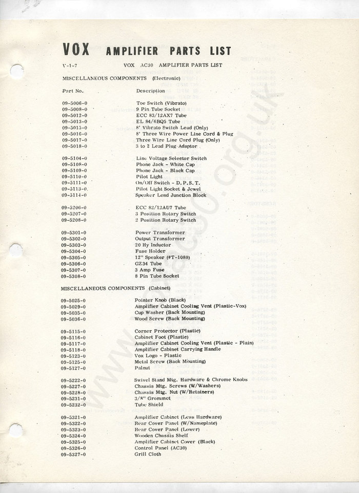 The Thomas Organ Vox Amplifier Service Manual compiled in 1966 contained five schematics relevant to AC30s: