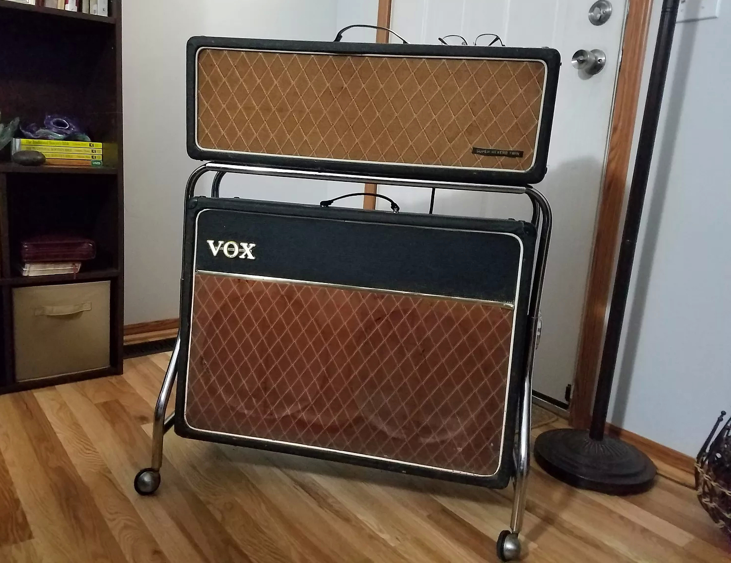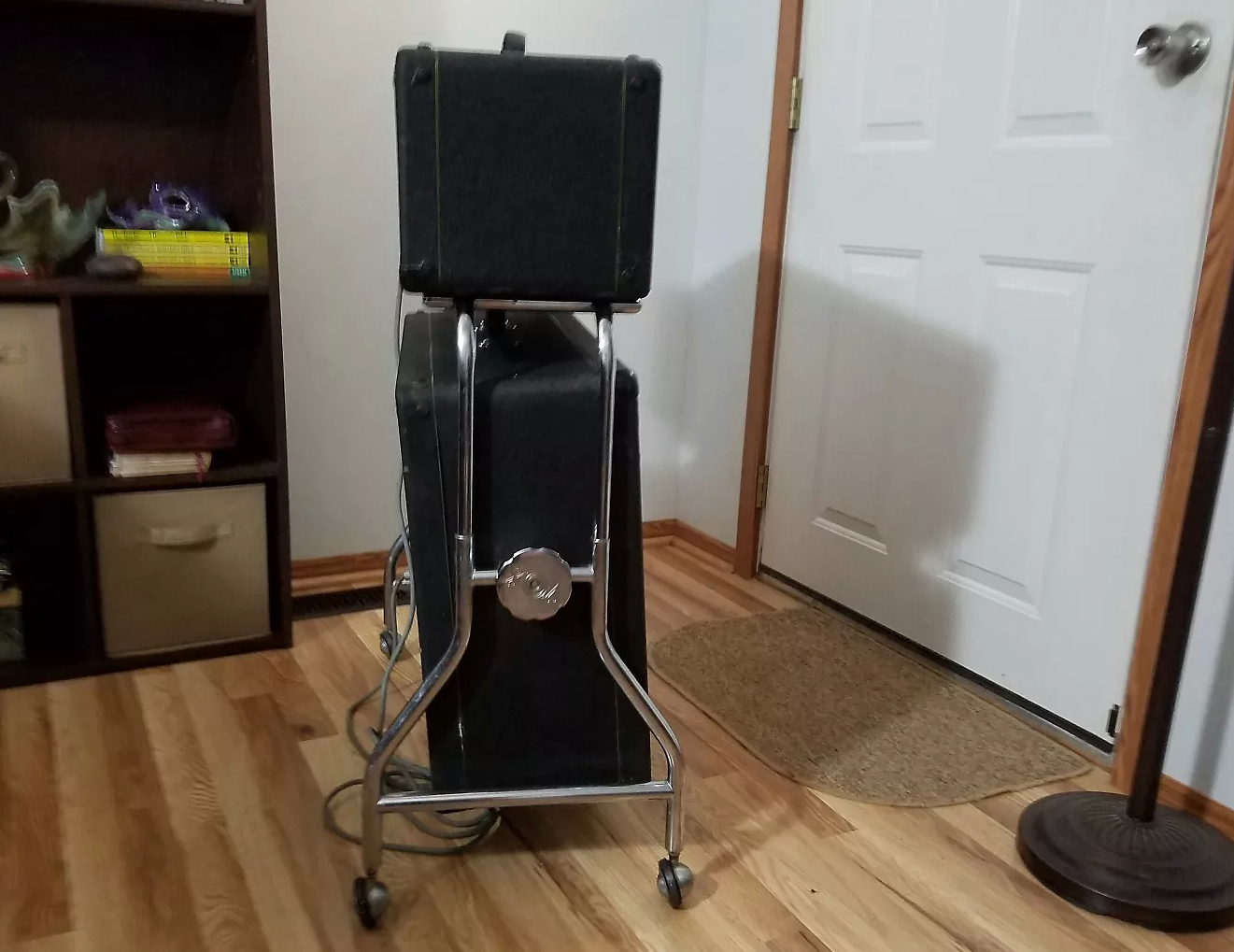 An early Super Twin trolley, a basket-top for the amp to sit in. The double bars are closer together than they are in later trolleys.