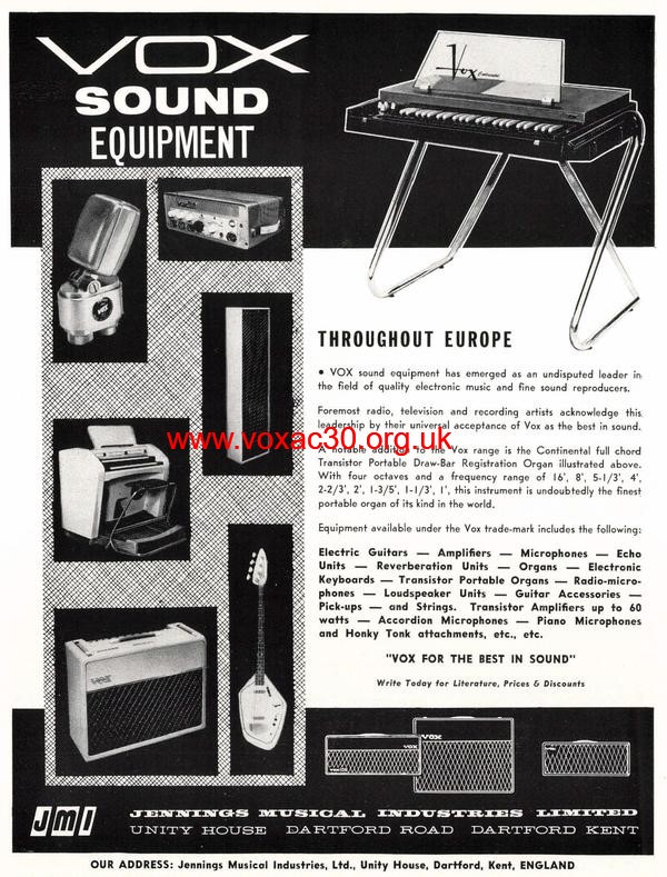 From Spring 1964, Tom's main drive changed though: to find a countrywide distributor for Vox/Jennings merchandise, not just a series of shops or dealers. At the NAMM show of 1964 - or perhaps more accurately in its wake - that search came to fruition in the shape of the Thomas Organ Company, with whom Tom already had a limited arrangement in relation to console organs - see this page. The "Million Dollar Deal" was announced to the public in late August 1964.