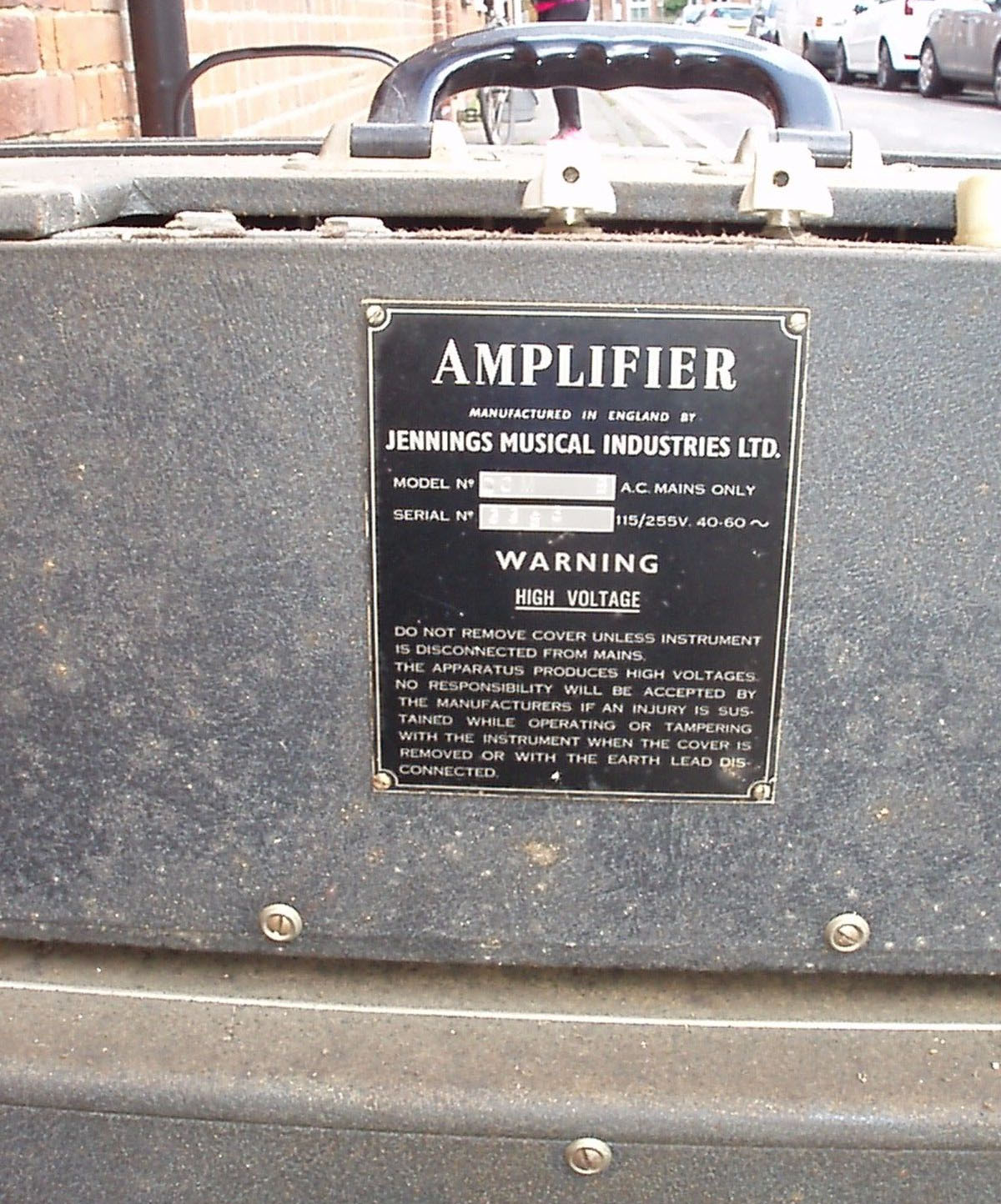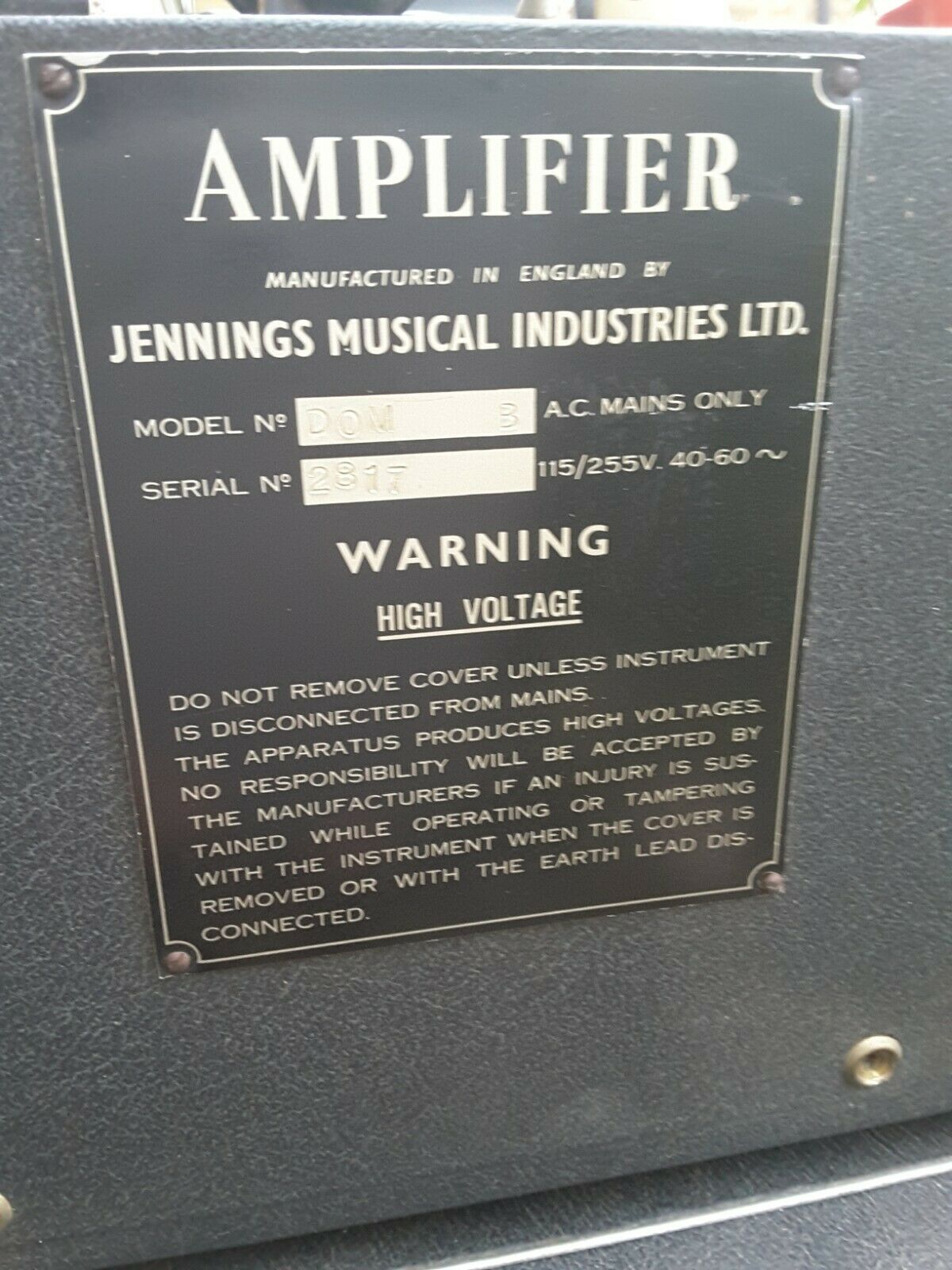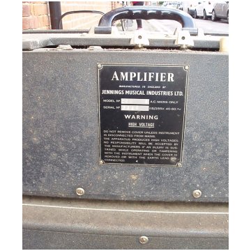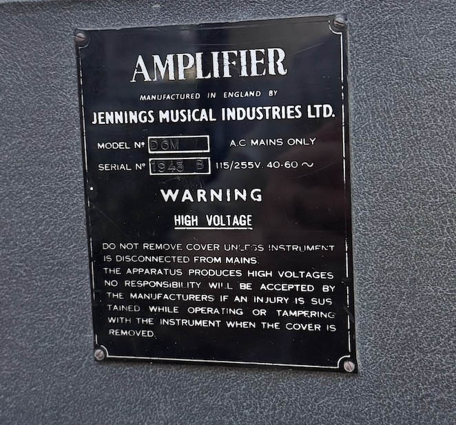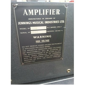 Serial number plates had "AMPLIFIER" at their head rather than "VOX AMPLIFIER". The three main types that were used can be seen on this page. Now and again amplifier sections were given bronze "Jennings" badges, doubtless left-overs from the late 1950s.