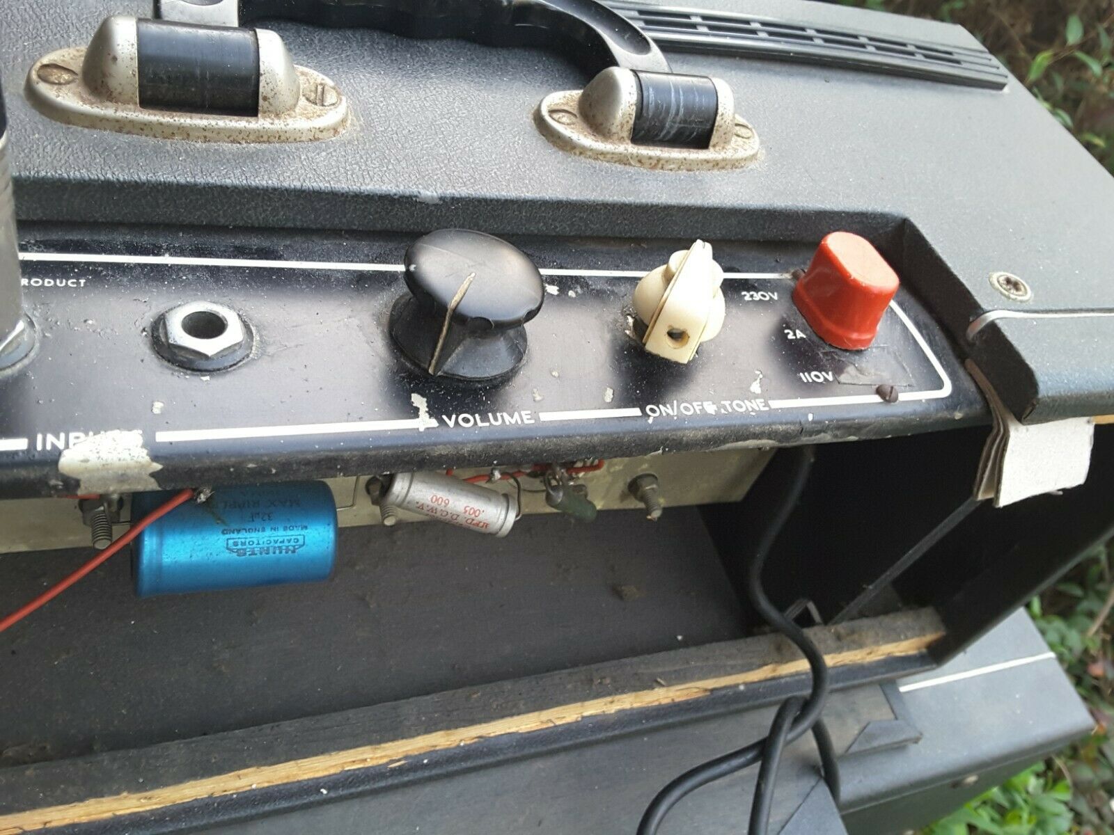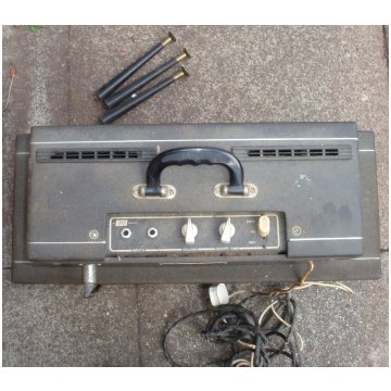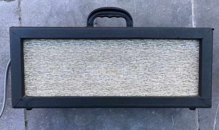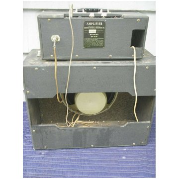 Old style amplifier case. Amplifier and speaker cabinet have rough oatmeal-coloured cloth, as for serial number 5076, below. The main Hunts filter capacitor has the date code "YAS" = 1st week of 1965.