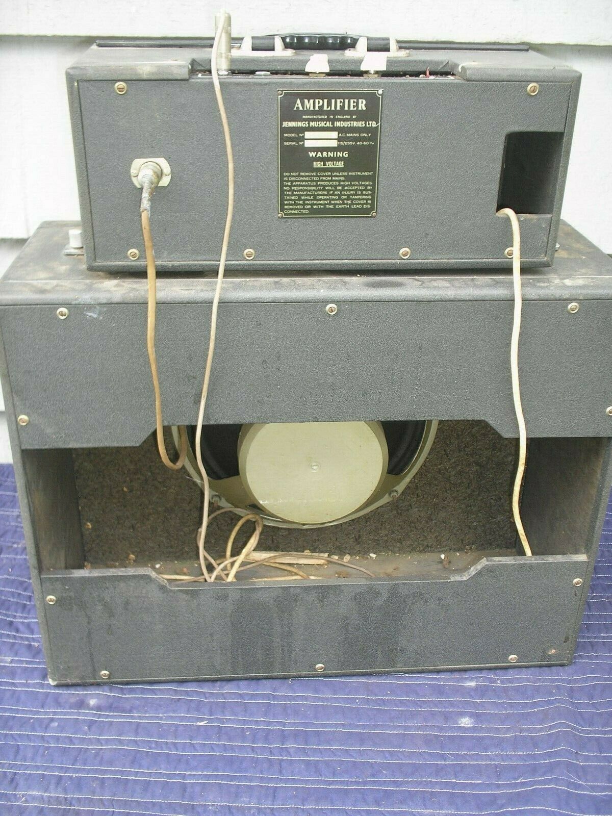 Vinyl front to the amplifier cabinet; grey cloth flecked with white (as pictured also in the Jennings flyer towards the top of this page) on the speaker cab. The speaker is a Fane, sprayed Jennings blue. Original amplifier mounting hardware still present. Thanks to Stephen for the pictures.