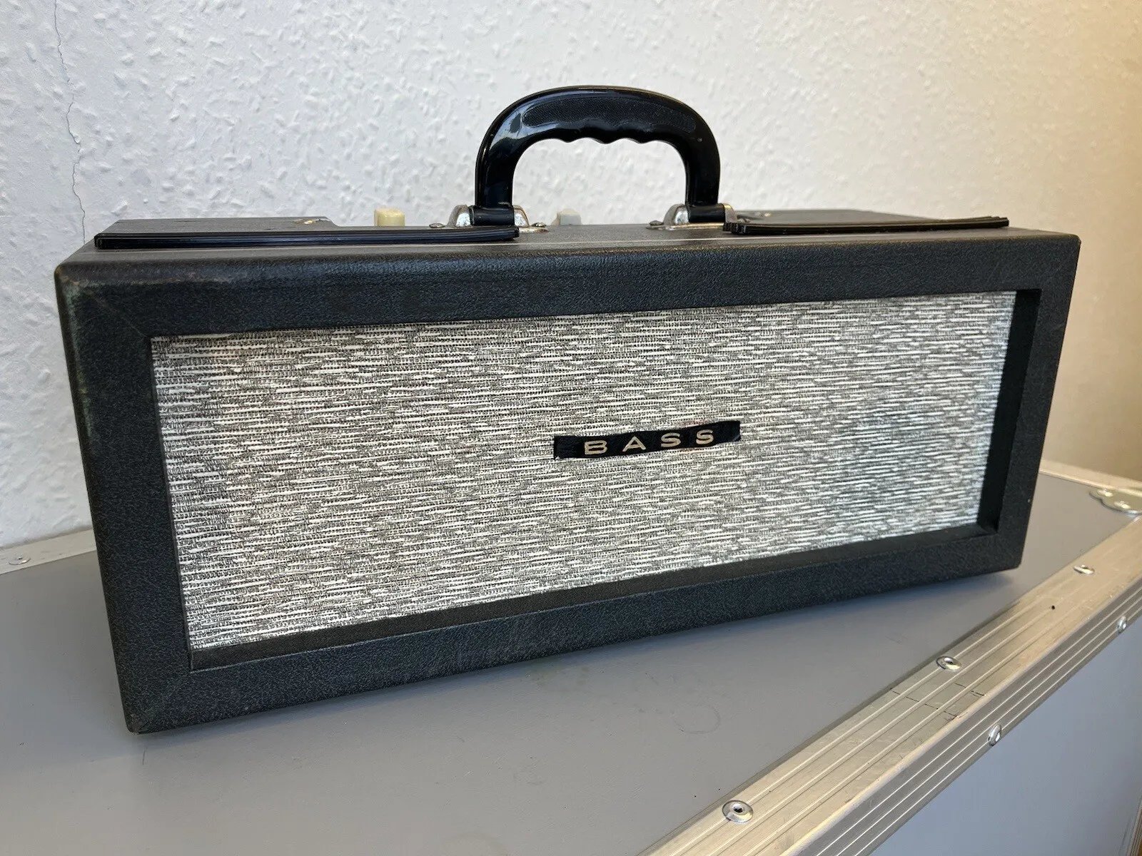 White/grey flecked cloth for both sections, finely textured dark grey vinyl, as above and below. The speaker is a Fane, frame unsprayed. The original fixing hardware - to secure the amplifier to the speaker cabinet - survives.