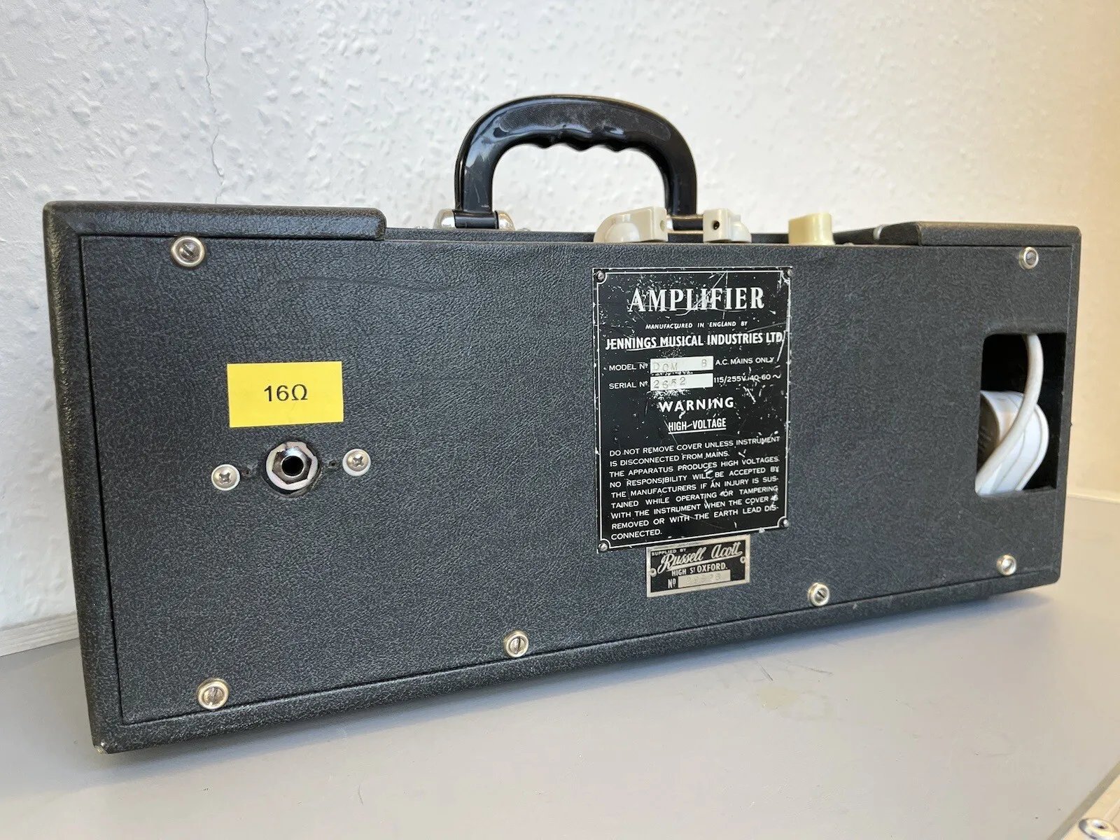 Amplifier section only. Chassis signed in pencil by "G" and "MJ". The main Hunts filter cap in the preamp has the date code "WST" = 15th week of 1964 for its manufacture; the power section filter has "WUT" = 16th week 1964. Sold by Russell Acott in Oxford, a Jennings dealer from the late 1950s