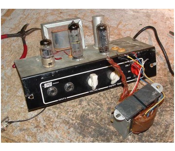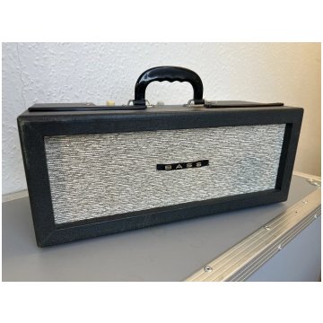 The circuit of the Domino Bass was effectively that of the AC4 (single channel, two inputs), but with the tremolo circuitry omitted, an adjusted vocing for "bass", and an output transformer designed for a speaker with an impedance of 15 rather than 3 ohms. The two controls are: volume, and combined on/off and tone. Three valves (rather than four) were employed: EZ80 rectifier, EF86 preamp gain, EL84 power valve. The mains tranformer allowed for operation at 110V and 230V, indicating that sales to America were, early on, an intention, or at least hope. The circuit diagram is OS/043, drawn by Mike Turner on 20th December, 1963. A single copy only is known to survive.