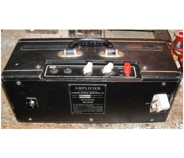 Machine stamped serial number plate. Rough oatmeal-coloured cloth for amplifier section and speaker cabinet. The former has a solid white handle, possibly a replacement.