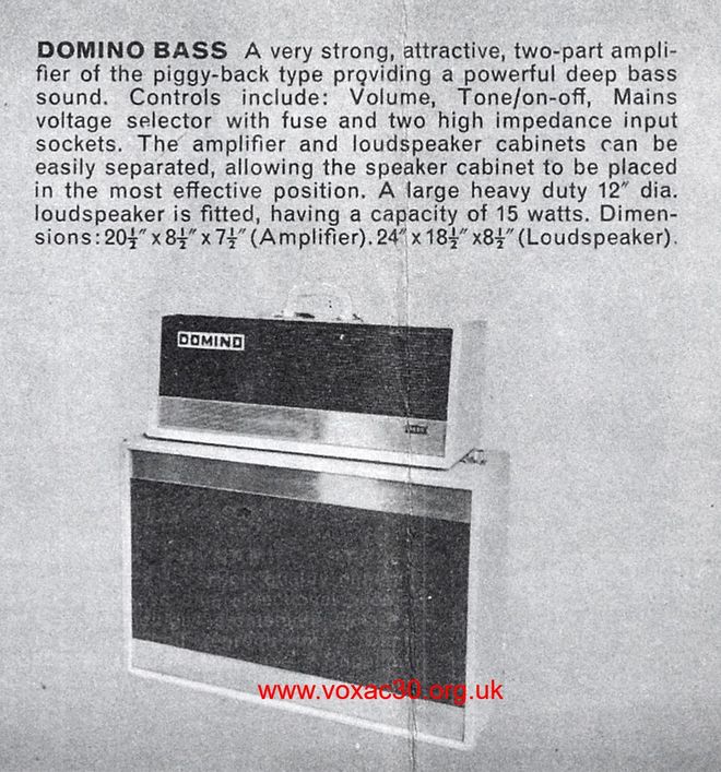 Below, a detail from one of the first adverts for the Domino range, late 1963. The amps were "unveiled" at the Russell Hotel Trade Fair at the end of August '63. The amplifier section of the Bass model was shown "back to front" - presumably to provide a more interesting view.