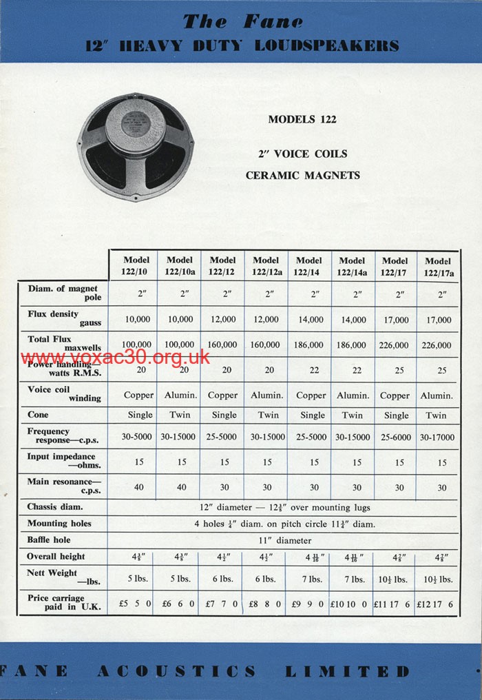 Speaker cabinets were generally fitted with a single 12" Fane 122/10 or 122/12, both ceramic magnet, 20 watts output, 15 ohm impedance. Fanes were a reliable cost-effective choice. Occasionally one finds a Fane 122/14, 22 watts handling, 15 ohm impedance.