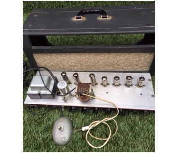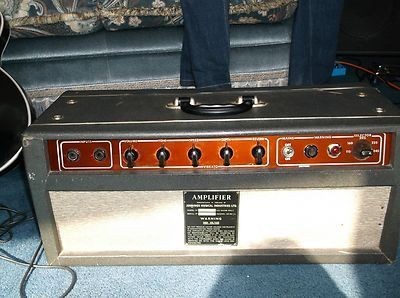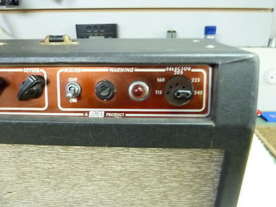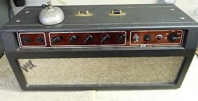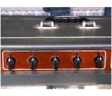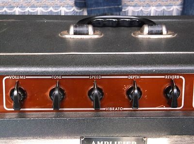 In broad outline, the amplifier has a single channel, two inputs, and five front-facing controls: Volume, Tone, Vibrato Speed and Depth, and Reverb. Power output was around 10-12 watts: