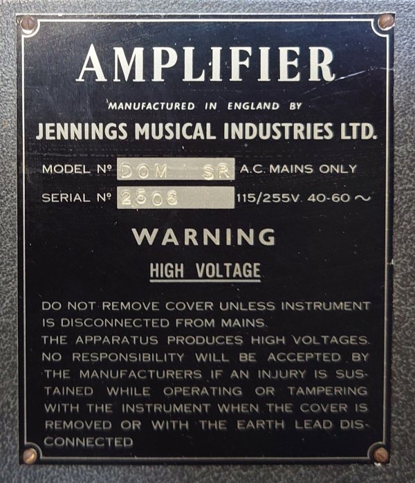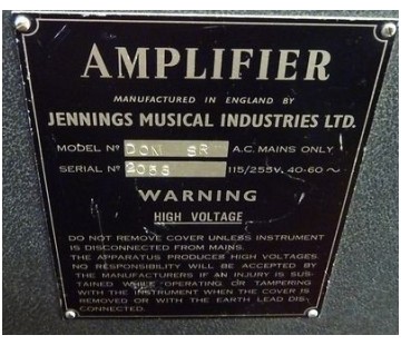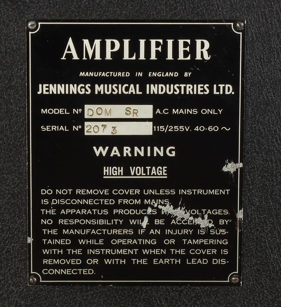 It seems that all Domino amplifiers shared a single serial number sequence starting at 1000. At present no Domino SRT has emerged , however, with a number under 2000, perhaps indicating that the model came to production slightly later than the others. The designation for the model stamped on the serial number plate was "SR". For the three types of plate used on Dominos, see this page.