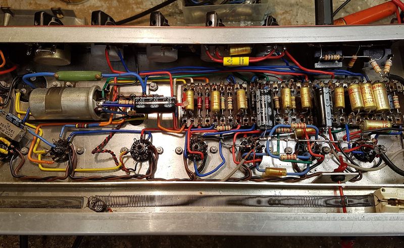 Inside the chassis. The green wirewound 1K dropping resistor can be seen above the can capacitor. The single spring reverb tank occupies most of the width of the enclosure.