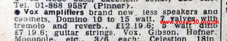The price of the new AC10 SRT on release in late 1964? - £84, that is to say £36 and 10 shillings more than the Domino Super Reverb, effectively for the same amplifier. The question naturally arising is did the Domino Super Reverb ever make a profit? Probably not is the answer. As for the AC10 SRT, most were evidently exported to the USA as part of the deal with Thomas Organ. A page on the model will be available shortly.