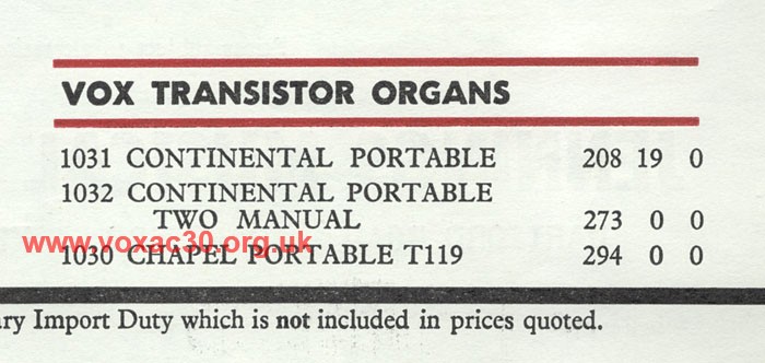 Detail from the JMI pricelist of November 1965. The dual manual Continental was one of the most expensive items in the Jennings range, topping a full AC100 SDL by a good margin.
