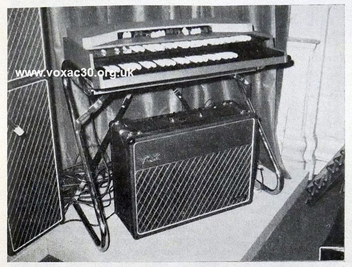 Dick Denney and "Miss Vox" at Frankfurt in 1966. The Super Continental can be made out at left, no face plate on the front of its lid, a guitar lying flat on top. The organ may have been used as the basis for the illustration on the front of the service manual (further below).