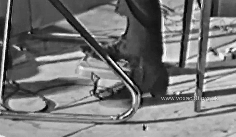 Evidently in early 1963 something new was required for the new Vox Continental - what better than to use a Fender volume pedal, its logo replaced and a resistor introduced to control the taper of the potentiometer. This was far from the only piece of JMI naughtiness in relation to Fender. JMI had been a British agent for the company since 1960, selling guitars and amplifiers at the shop on Charing Cross Road. Quite how many pedals were re-adjusted in this way is unknown - probably no more than 100 or so though. As for early photos, Mike Smith of the Dave Clark Five is seen with one at the Tottenham Royal, late January 1964, photographed by various news agencies (and by a photographer sent by JMI), and filmed by Pathe, the newsreel people. See further below for a still from Pathe footage. The main page on the Continental is here.