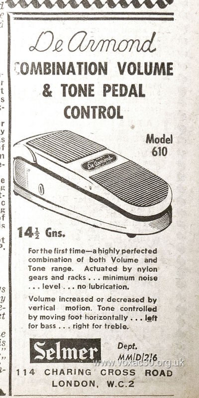 It is perhaps worth noting that Selmer stocked this type of pedal, branded DeArmand, in its shop on Charing Cross Road (a few doors down from the Jennings shop) from mid 1962. Selmer not only had its own range of organs at the time, but acted as agent for Lowrey and Farfisa.